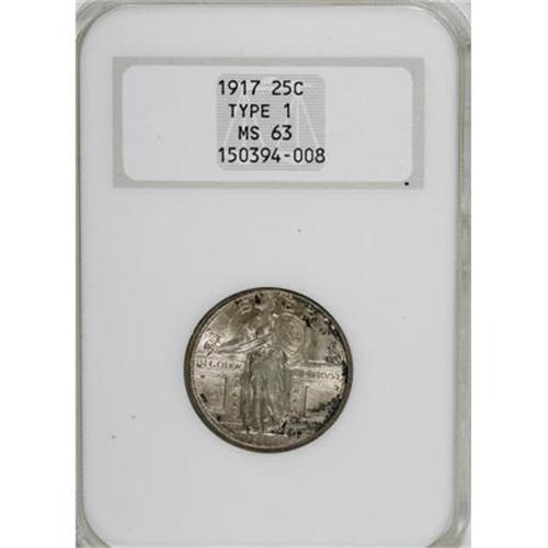 <B>1917 25C Type One MS63 NGC.</B></I> NGC Census: (240/720). PCGS Population (480/855). Mintage: 8,740,000. Numismedia Wsl. Price for NGC/PCGS coin in MS63: $240. (#5706)<BR><BR><B>Coin Engraver:</B> Hermon A. MacNeil<BR><BR><b>Shipping:</b> Coins & Currency (<a target="_blank" href="http://www.heritageauctions.com/common/shipping.php">view shipping information</a>)