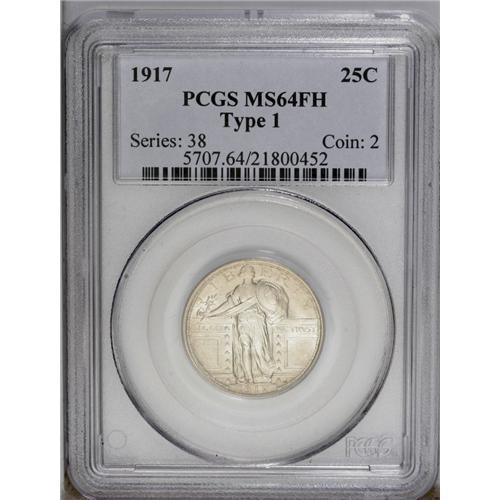 <B>1917<25C> Type One MS64 Full Head PCGS.</B></I> Potent luster brightens this lightly toned and intricately struck type coin. The reverse is splendidly preserved, as is the obverse field, while the Standing Liberty displays only moderate marks.