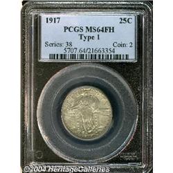 <B>1917<25C> Type One MS64 Full Head PCGS.</B></I> Crisply struck, with complete details throughout, satin-like luster, and impeccable surface preservation. The even dove-gray color is accented by apricot iridescence near some of the reverse devices. <BR><BR><B>Important notice:</B> Heritage usually auctions material at the rate of 200-250 lots per hour. On some occasions eBay Live bid software or the Internet may not be able to keep up with the pace of the auction. We recommend placing a realistic absentee bid now as insurance to avoid disappointment. Occasionally the auctioneer may eliminate or reject an eBay Live bid, and the auctioneer may also reopen a lot after the close of the eBay live bidding (usually because we missed an audience bid), and may reject your bid even if it shows you as the winning bidder. By bidding via eBay Live, you agree that Heritage may award the lot to another bidder at its sole discretion under the circumstances described above or any other reasonable circumstances. Since eBay bids are not shown to us until we open the lot on the floor, we treat those bids just like floor bids. In most cases the floor responds before the eBay bid is presented to us, due to Internet lag time, so for consistency we have made it a policy that floor bids are always considered first over tie eBay live bids. Also please note that all Heritage lots purchased through eBay Live carry a 20% Buyer's Premium. Please make sure you read the Terms and Conditions before you bid.