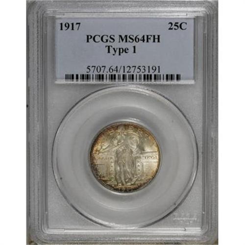<B>1917 25C Type One MS64 Full Head PCGS.</B></I> Light, hazy patina drapes each side of this solidly struck Choice coin, an excellent piece for the type collector. Vivid gold-orange shadings enliven the margins, while the centers are primarily silver-gray.<BR><BR><B>Coin Engraver:</B> Hermon A. MacNeil<BR><BR><b>Shipping:</b> Coins & Currency (<a target="_blank" href="http://www.heritageauctions.com/common/shipping.php">view shipping information</a>)