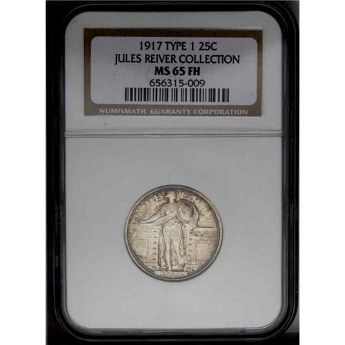 <B>1917<25C> Type One MS65 Full Head NGC.</B></I> A gorgeous chestnut-gray Gem. Vibrant luster sweeps across the nearly unmarked surfaces. A pinpoint strike is characteristic of the Type One design. A high mintage for the era and a dynamic new design led to a quantity of quality Mint State survivors, but these are always in demand as a short-lived type.