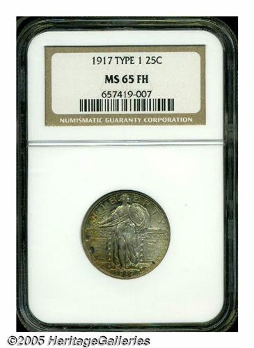 <B>1917<25C> Type One MS65 Full Head NGC.</B></I> Reddish-gold patina with greenish undertones occupies portions of the obverse and the entire reverse. All of the design elements are sharply impressed, and the lustrous surfaces are virtually devoid of significant marks.