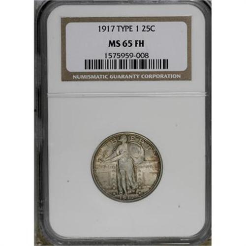<B>1917 25C Type One MS65 Full Head NGC.</B></I> A satiny and elegantly toned Gem example of this popular type issue, crisply detailed with remarkable eye appeal. Subtle pink, lavender, and golden-tan tints rest over silver-gray surfaces.<BR><BR><B>Coin Engraver:</B> Hermon A. MacNeil<BR><BR><b>Shipping:</b> Coins & Currency (<a target="_blank" href="http://www.heritageauctions.com/common/shipping.php">view shipping information</a>)