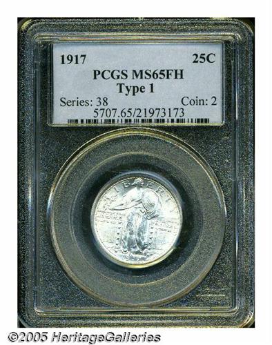 <B>1917<25C> Type One MS65 Full Head PCGS.</B></I> Boldly struck and highly lustrous, with satiny, matte-like surfaces that are untoned and blemish-free, on the obverse. Extremely faint apricot peripheral toning and a handful of tiny contact marks are found on the reverse.