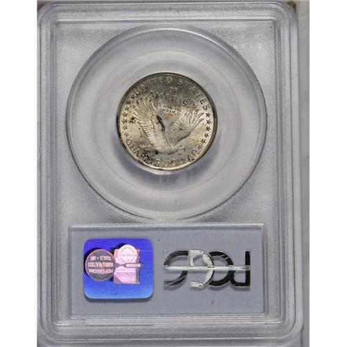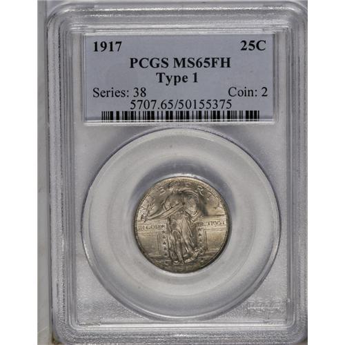 <B>1917<25C> Type One MS65 Full Head PCGS.</B></I> Lovely green-gray toning covers the obverse, as speckled red-brown, russet, and sky-blue coloration occurs on the reverse. Well struck with satin luster and nearly pristine surfaces.
