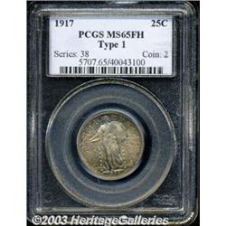 1917 25C Type One MS65 Full Head PCGS. One has to like toning to appreciate this coin, but given that most advanced collectors do, this is certainly an easy coin to like. Fully struck in all areas with complete rivets on the shield, both sides are covered with deep golden-russet, rose, and charcoal toning with exceptionally bright underlying mint frost. Important notice: Heritage usually auctions material at the rate of 200-250 lots per hour. On some occasions eBay Live bid software or the Internet may not be able to keep up with the pace of the auction. We recommend placing a realistic absentee bid now as insurance to avoid disappointment. Occasionally the auctioneer may eliminate or reject an eBay Live bid, and the auctioneer may also reopen a lot after the close of the eBay live bidding (usually because we missed an audience bid), and may reject your bid even if it shows you as the winning bidder. By bidding via eBay Live, you agree that Heritage may award the lot to another bidder at its sole discretion under the circumstances described above or any other reasonable circumstances. Also please note that all Heritage lots purchased through eBay Live carry a 20% Buyer's Premium. Please make sure you read the Terms and Conditions before you bid.