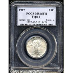<B>1917<25C> Type One MS65 Full Head PCGS.</B></I> Smooth and lustrous with finely grained surfaces. A boldly struck Gem and worthy of inclusion in a fine collection. <BR><BR><B>Important notice:</B> Heritage usually auctions material at the rate of 200-250 lots per hour. On some occasions eBay Live bid software or the Internet may not be able to keep up with the pace of the auction. We recommend placing a realistic absentee bid now as insurance to avoid disappointment. Occasionally the auctioneer may eliminate or reject an eBay Live bid, and the auctioneer may also reopen a lot after the close of the eBay live bidding (usually because we missed an audience bid), and may reject your bid even if it shows you as the winning bidder. By bidding via eBay Live, you agree that Heritage may award the lot to another bidder at its sole discretion under the circumstances described above or any other reasonable circumstances. Since eBay bids are not shown to us until we open the lot on the floor, we treat those bids just like floor bids. In most cases the floor responds before the eBay bid is presented to us, due to Internet lag time, so for consistency we have made it a policy that floor bids are always considered first over tie eBay live bids. Also please note that all Heritage lots purchased through eBay Live carry a 20% Buyer's Premium. Please make sure you read the Terms and Conditions before you bid.