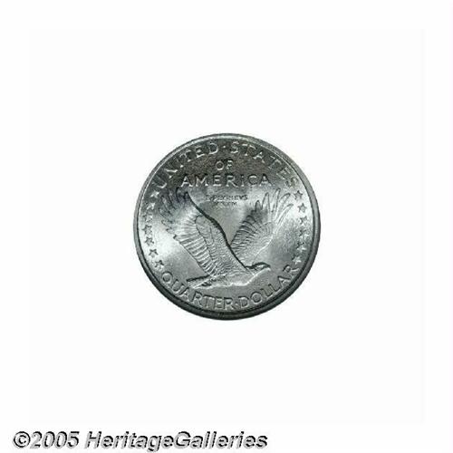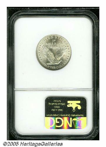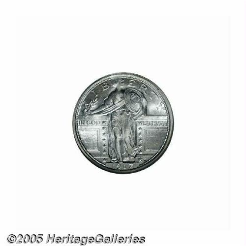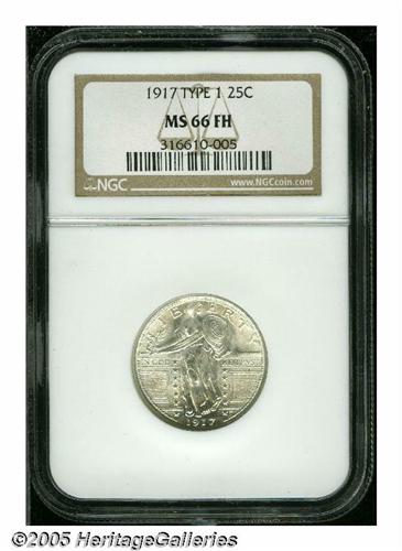 <B>1917<25C> Type One MS66 Full Head NGC.</B></I> A brilliant and extremely lustrous Premium Gem that has frosty, matte-like surfaces. The strike has the razor-sharp quality that is rarely found outside of the 1917 Type One issues. The only notable distraction is a small milling mark just below the eagle's throat.