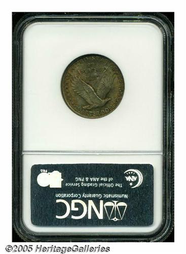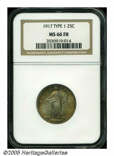 <B>1917<25C> Type One MS66 Full Head NGC.</B></I> Excellent design detail is evident on the devices. Aside from the full head, the rivets are bold, the inner shield displays the vertical stripes and some of the horizontal stripes, and most of the eagle's torso feathers are there. Medium intensity orange-gold toning overlays lustrous surfaces. A couple of minute marks are noted on Liberty's outstretched arm. Only 51 pieces are graded higher by NGC (4/05).