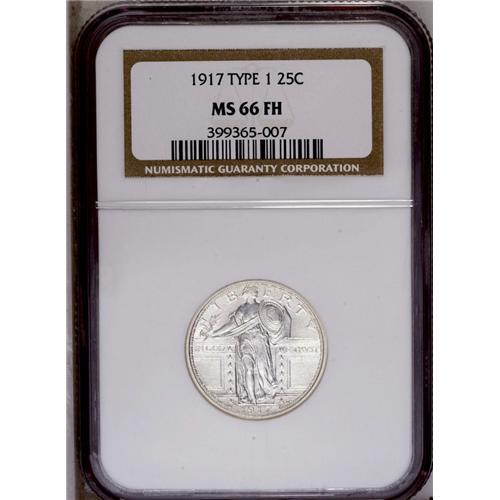 <B>1917<25C> Type One MS66 Full Head NGC.</B></I> Highly lustrous and fully struck with frosty silver surfaces. This is an extremely important opportunity for the type collector to obtain the only reasonably affordable date of the Type One design. The NGC Census shows that only 51 finer Full Head examples of this issue have been certified. This is not a large number of coins in relation to either the mintage or the current demand.