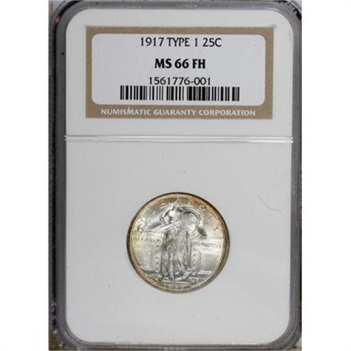 <B>1917 25C Type One MS66 Full Head NGC.</B></I> A trace of gold toning visits the peripheries of this amazing, attentively struck piece. Both sides have frosty silver luster and pristine surfaces, save for a slight luster graze on the obverse. Only 53 finer examples have been certified by NGC (6/07).<BR><BR><b>Shipping:</b> Coins & Currency (<a target="_blank" href="http://www.heritageauctions.com/common/shipping.php">view shipping information</a>)