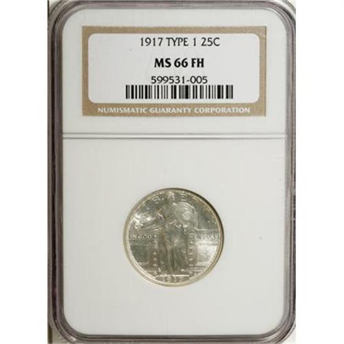<B>1917 25C Type One MS66 Full Head NGC.</B></I> This coin demonstrates just how attractive a Type One Standing Liberty quarter can be. Fully struck with lovely, pale silver-gold toning that is illuminated by gleaming luster. The matte-like surfaces are virtually pristine. <BR><BR><B>Coin Engraver:</B> Hermon A. MacNeil<BR><BR><b>Shipping:</b> Coins & Currency (<a target="_blank" href="http://www.heritageauctions.com/common/shipping.php">view shipping information</a>)