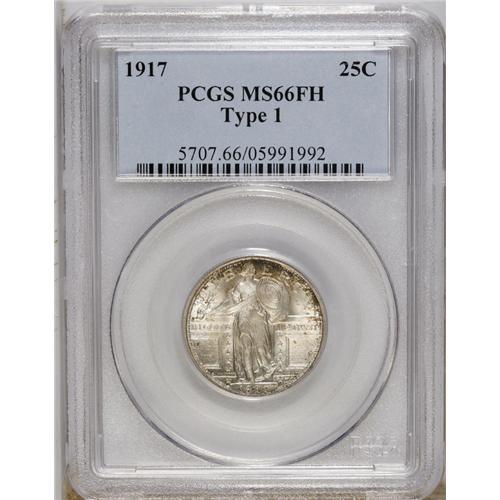 <B>1917 25C Type One MS66 Full Head PCGS.</B></I> Highly lustrous surfaces exhibit wisps of olive-gold patina along the peripheries. The bold strike goes beyond the full head to include excellent definition on the shield and eagle's feathers.<BR><BR><b>Shipping:</b> Coin/Currency (<a target="_blank" href="http://www.heritageauctions.com/common/shipping.php">view shipping information</a>)