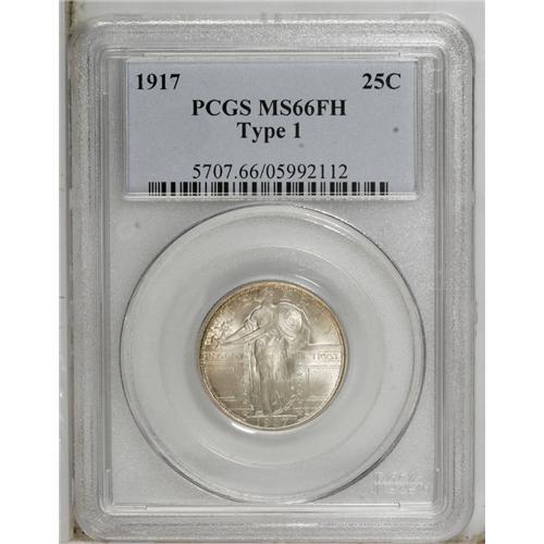 <B>1917 25C Type One MS66 Full Head PCGS.</B></I> The undisturbed dove-gray surfaces possess wisps of apricot and champagne color along the margins. A lovely type coin with gleaming luster and a bold strike. Both sides of the piece are pristine, or essentially so.<BR><BR><b>Shipping:</b> Coin/Currency (<a target="_blank" href="http://www.heritageauctions.com/common/shipping.php">view shipping information</a>)