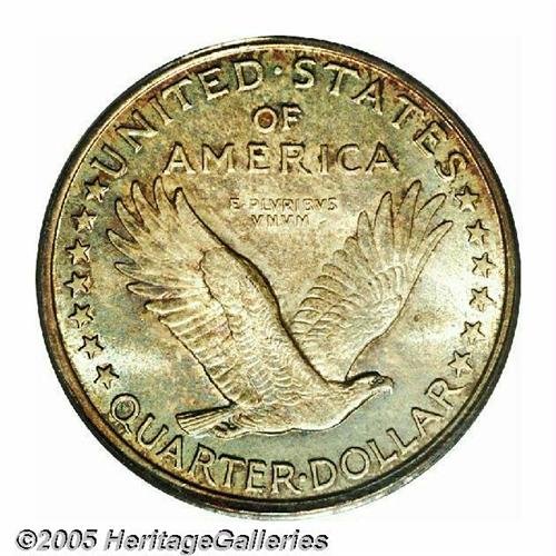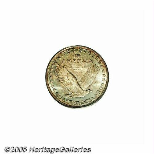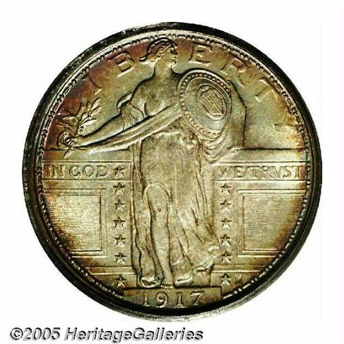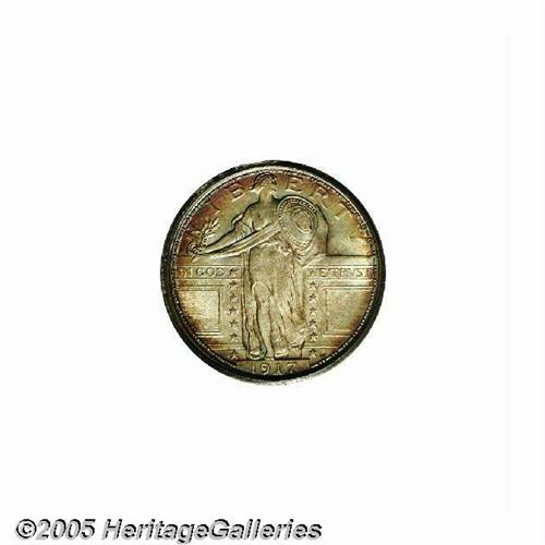 <B>1917<25C> Type One MS66 Full Head PCGS.</B></I> Toned with attractive sunset-gold and light-turquoise with the center brighter gold. Perfectly matched on the reverse in color. Sharply impressed throughout, as expected, and this would make a fine addition to a type or date collection. While not particularly rare in this grade, finding an example with such colorful toning can be a challenge.<BR><I>From The Melrose Bay Collection.</B></I>