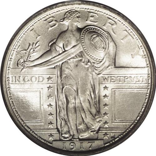 <B>1917<25C> Type One MS66 Full Head PCGS.</B></I> Virtually untoned with rich, frosty surfaces. In fact, this coin exhibits a similarity to the legendary matte proofs because of its razor sharp detail. Just a hint of mottled tan color is seen near the base of the reverse at certain light angles. A notable specimen.
