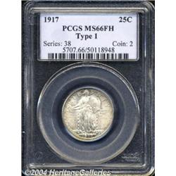 <B>1917<25C> Type One MS66 Full Head PCGS.</B></I> The fullness of strike on this coin is not limited to the head of Liberty. Rather, all the rivets in the shield and inner shield lines are also fully delineated. The surfaces have a fine-grain texture and each side shows light golden toning, most especially around the margins. Superior luster characteristics also. <BR><BR><B>Important notice:</B> Heritage usually auctions material at the rate of 200-250 lots per hour. On some occasions eBay Live bid software or the Internet may not be able to keep up with the pace of the auction. We recommend placing a realistic absentee bid now as insurance to avoid disappointment. Occasionally the auctioneer may eliminate or reject an eBay Live bid, and the auctioneer may also reopen a lot after the close of the eBay live bidding (usually because we missed an audience bid), and may reject your bid even if it shows you as the winning bidder. By bidding via eBay Live, you agree that Heritage may award the lot to another bidder at its sole discretion under the circumstances described above or any other reasonable circumstances. Since eBay bids are not shown to us until we open the lot on the floor, we treat those bids just like floor bids. In most cases the floor responds before the eBay bid is presented to us, due to Internet lag time, so for consistency we have made it a policy that floor bids are always considered first over tie eBay live bids. Also please note that all Heritage lots purchased through eBay Live carry a 20% Buyer's Premium. Please make sure you read the Terms and Conditions before you bid. </span></font></tr></table></td></tr></table>