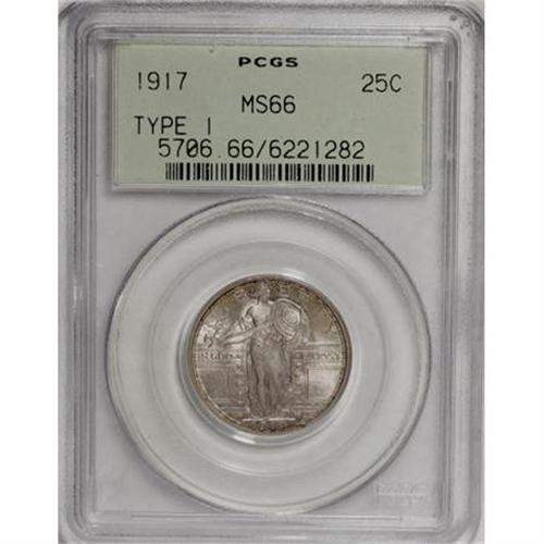 <B>1917 25C Type One MS66 PCGS.</B></I> Tan-gold and olive intermingle across this scintillating Premium Gem. The strike is exquisite, and the preservation is exceptional. The head appears full, but not certified as such, perhaps due to its old green label holder. Population: 37 in 66, 1 finer (10/07).<BR><I>From The Chandler Collection.</B></I><BR><BR><B>Coin Engraver:</B> Hermon A. MacNeil<BR><BR><b>Shipping:</b> Coins & Currency (<a target="_blank" href="http://www.heritageauctions.com/common/shipping.php">view shipping information</a>)