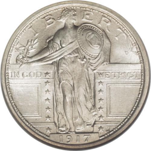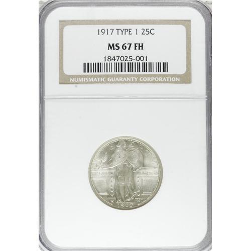 <B>1917 25C Type One MS67 Full Head NGC.</B></I> A boldly impressed and exquisitely preserved representative of this ever-popular type issue, frosty with a hint of satin on the obverse. The reverse fields exhibit a degree of orange-peel effect beneath whispers of ice-blue and amber patina. Neither NGC nor PCGS has graded a numerically finer example (4/07).<BR><BR><b>Shipping:</b> Coins & Currency (<a target="_blank" href="http://www.heritageauctions.com/common/shipping.php">view shipping information</a>)
