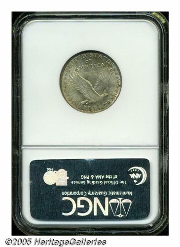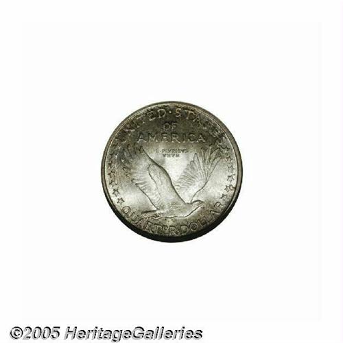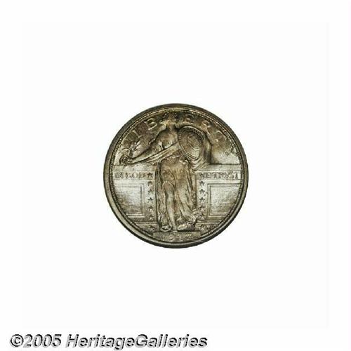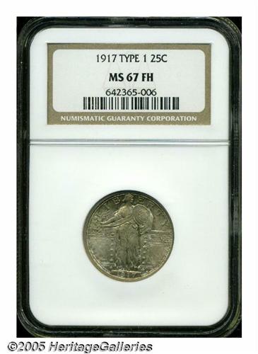 <B>1917<25C> Type One MS67 Full Head NGC.</B></I> Boldly struck, not just on Liberty's head but on all of the design elements over each side, including the rivets on the outer shield, the horizontal and vertical lines on the inner shield, and the eagle's breast feathers. The frosty surfaces yield a light golden-gray appearance, and are devoid of significant contact marks. As of June 2005, neither NGC nor PCGS have certified any finer pieces with Full Head. Population: 47 in 67, 0 finer (6/05).