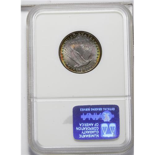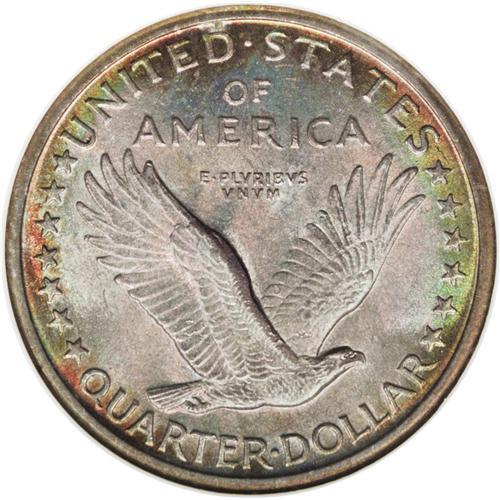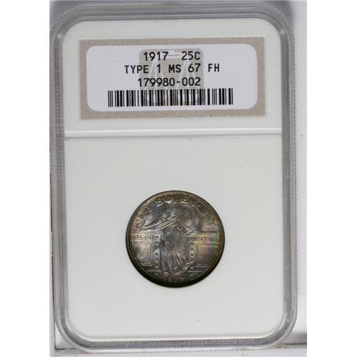 <B>1917 25C Type One MS67 Full Head NGC.</B></I> Dramatically toned in cherry-red, apple-green, and pumpkin-gold throughout the reverse. Sea-green, plum, and powder-blue shades embrace the obverse. The strike is intricate, and the obverse is unabraded. A couple of tiny ticks on the eagle's wings are of little import. Unexcelled at either major service. Census: 51 in 67 Full Head, 0 finer (10/06).<BR><BR><b>Shipping:</b> Coin/Currency (<a target="_blank" href="http://www.heritageauctions.com/common/shipping.php">view shipping information</a>)