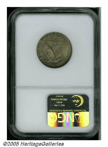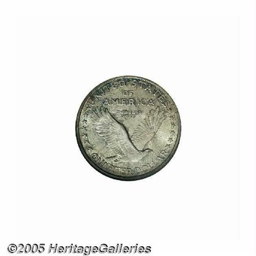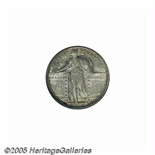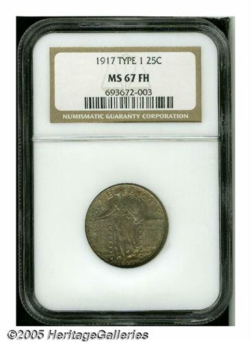 <B>1917<25C> Type One MS67 Full Head NGC.</B></I> Fully struck, not just on Liberty's head but on all of the design elements on each side, including the rivets on the shield and the eagle's breast feathers. The surfaces are heavily frosted also, this attribute still being fully apparent even through the multiple shadings of deep blue, gray, and rose toning that cover each side.