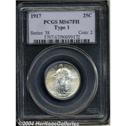 <B>1917<25C> Type One MS67 Full Head PCGS.</B></I> A splendid, satiny-white example that looks as though it just came off the coin press. All details are typically needle sharp and nicely frosted. Population: 51 in 67, 0 finer (3/04).<BR><I>From The Del Rio Collection, Part One.</B></I> <BR><BR><B>Important notice:</B> Heritage usually auctions material at the rate of 200-250 lots per hour. On some occasions eBay Live bid software or the Internet may not be able to keep up with the pace of the auction. We recommend placing a realistic absentee bid now as insurance to avoid disappointment. Occasionally the auctioneer may eliminate or reject an eBay Live bid, and the auctioneer may also reopen a lot after the close of the eBay live bidding (usually because we missed an audience bid), and may reject your bid even if it shows you as the winning bidder. By bidding via eBay Live, you agree that Heritage may award the lot to another bidder at its sole discretion under the circumstances described above or any other reasonable circumstances. Since eBay bids are not shown to us until we open the lot on the floor, we treat those bids just like floor bids. In most cases the floor responds before the eBay bid is presented to us, due to Internet lag time, so for consistency we have made it a policy that floor bids are always considered first over tie eBay live bids. Also please note that all Heritage lots purchased through eBay Live carry a 20% Buyer's Premium. Please make sure you read the Terms and Conditions before you bid. </span></font></tr></table></td></tr></table>