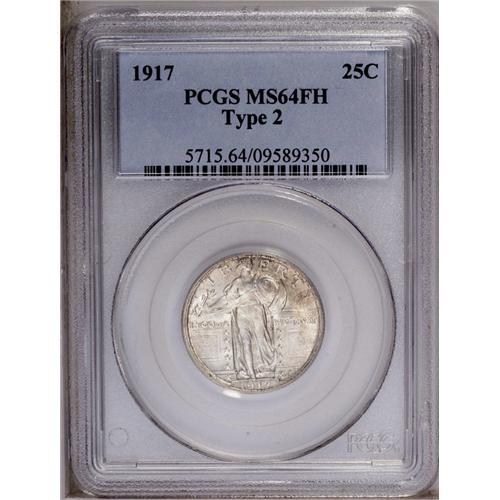 <B>1917<25C> Type Two MS64 Full Head PCGS.</B></I> Sharply struck throughout, the mostly brilliant surfaces show just a dab of light reddish patina on each side. One contact mark on Liberty's leg serves to limit the grade.