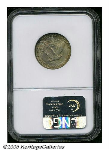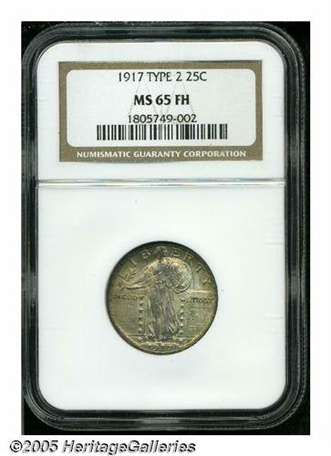 <B>1917<25C> Type Two MS65 Full Head NGC.</B></I> Medium golden-gray patina overlays fully lustrous surfaces. Excellent strike definition prevails over the design elements, with the only areas displaying a touch of softness being portions of the eagle's torso. A couple of minute marks appear on Liberty's upper legs. Population: 98 in 65, 47 finer (5/05).