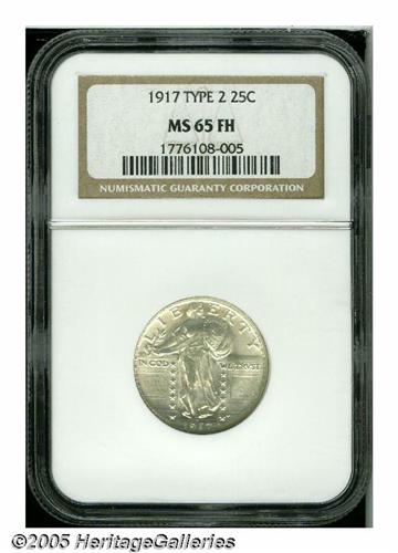 <B>1917<25C> Type Two MS65 Full Head NGC.</B></I> Untoned with incredibly frosty, snowy-white features. The head detail is amazingly sharp. Outstanding quality for this first year of type. Population: 98 in 65 Full Head, 47 finer (4/05).