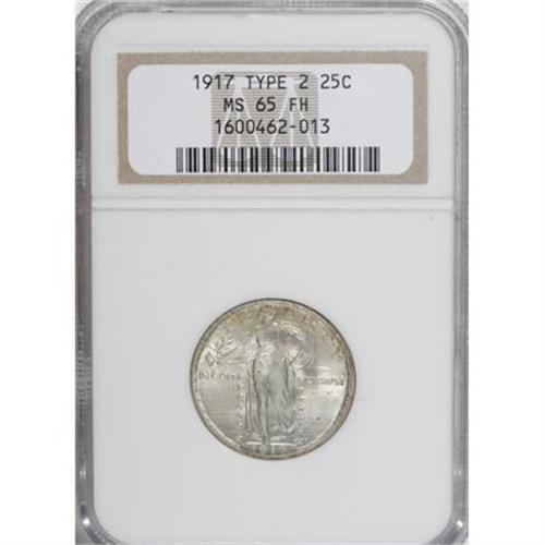 <B>1917 25C Type Two MS65 Full Head NGC.</B></I> Boldly struck with full details on Liberty's head and shield rivets. Pleasing satin luster shimmers across both sides. The creamy alabaster coloration yields to speckled russet patina near the obverse periphery. Surface blemishes are nearly nonexistent. <BR><BR><b>Shipping:</b> Coins & Currency (<a target="_blank" href="http://www.heritageauctions.com/common/shipping.php">view shipping information</a>)