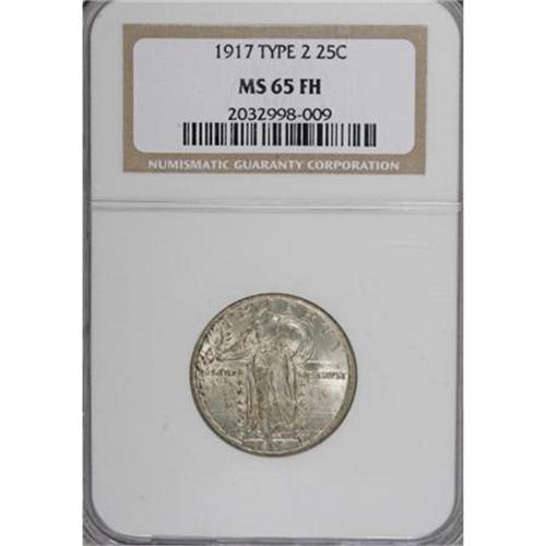 <B>1917 25C Type Two MS65 Full Head NGC.</B></I> Light streaks of olive-green toning cover both sides of this highly lustrous early Type Two quarter. Decisively struck, not only on Liberty's head but also on the shield and drapery.<BR><BR><B>Coin Engraver:</B> Hermon A. MacNeil<BR><BR><b>Shipping:</b> Coins & Currency (<a target="_blank" href="http://www.heritageauctions.com/common/shipping.php">view shipping information</a>)
