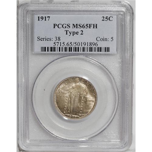<B>1917<25C> Type Two MS65 Full Head PCGS.</B></I> Gold and lavender patina covers both lustrous sides. Strongly struck with excellent head detail, though Liberty's armor and shield show a touch of weakness. A Gem with great eye appeal.