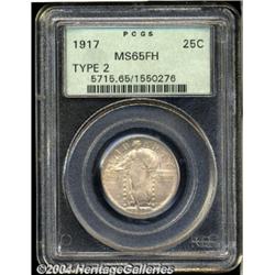 <B>1917<25C> Type Two MS65 Full Head PCGS.</B></I> A beautiful Type Two Standing Liberty quarter, the obverse is adorned with awesome pale gold-violet toning, while the reverse is light-gold. The design elements are well struck throughout, and the lustrous surfaces are seemingly free of major abrasions. <BR><BR><B>Important notice:</B> Heritage usually auctions material at the rate of 200-250 lots per hour. On some occasions eBay Live bid software or the Internet may not be able to keep up with the pace of the auction. We recommend placing a realistic absentee bid now as insurance to avoid disappointment. Occasionally the auctioneer may eliminate or reject an eBay Live bid, and the auctioneer may also reopen a lot after the close of the eBay live bidding (usually because we missed an audience bid), and may reject your bid even if it shows you as the winning bidder. By bidding via eBay Live, you agree that Heritage may award the lot to another bidder at its sole discretion under the circumstances described above or any other reasonable circumstances. Since eBay bids are not shown to us until we open the lot on the floor, we treat those bids just like floor bids. In most cases the floor responds before the eBay bid is presented to us, due to Internet lag time, so for consistency we have made it a policy that floor bids are always considered first over tie eBay live bids. Also please note that all Heritage lots purchased through eBay Live carry a 20% Buyer's Premium. Please make sure you read the Terms and Conditions before you bid.