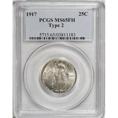 <B>1917 25C Type Two MS65 Full Head PCGS.</B></I> Produced later in the year when much of the clamor about the new Standing Liberty quarter had been exhausted and the original "risque" design was replaced by the less offensive Type Two issue, far fewer were put away for posterity. This creamy-smooth Gem is boldly struck in all areas and displays speckled toning about the obverse periphery as well as across much of the reverse.<BR><BR><B>Coin Engraver:</B> Hermon A. MacNeil<BR><BR><b>Shipping:</b> Coins & Currency (<a target="_blank" href="http://www.heritageauctions.com/common/shipping.php">view shipping information</a>)