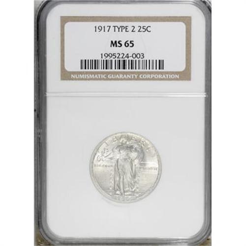 <B>1917 25C Type Two MS65 NGC.</B></I> NGC Census: (58/35). PCGS Population (83/22). Mintage: 13,880,000. Numismedia Wsl. Price for NGC/PCGS coin in MS65: $480. (#5714)<BR><BR><B>Coin Engraver:</B> Hermon A. MacNeil<BR><BR><b>Shipping:</b> Coins & Currency (<a target="_blank" href="http://www.heritageauctions.com/common/shipping.php">view shipping information</a>)