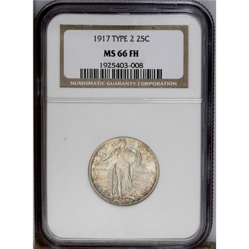 <B>1917<25C> Type Two MS66 Full Head NGC.</B></I> The sharp strike transcends Liberty's head to include high definition on the stripes of the inner shield, Liberty's toes, and the eagle's wing feathers. Census: 37 in 66, 8 finer (3/06).