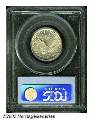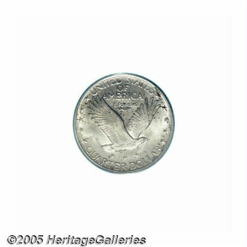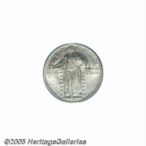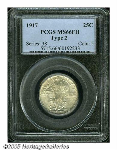<B>1917<25C> Type Two MS66 Full Head PCGS.</B></I> Excellent strike definition prevails over the design elements, with the only areas displaying a touch of softness being the digits of the date, the lower rivets, and portions of the eagle's torso. Lustrous surfaces yield a golden-gray appearance with freckled toning spots, which are more numerous on the reverse. Some light contact marks are visible on Liberty's torso. Population: 51 in 66, 5 finer (6/05).