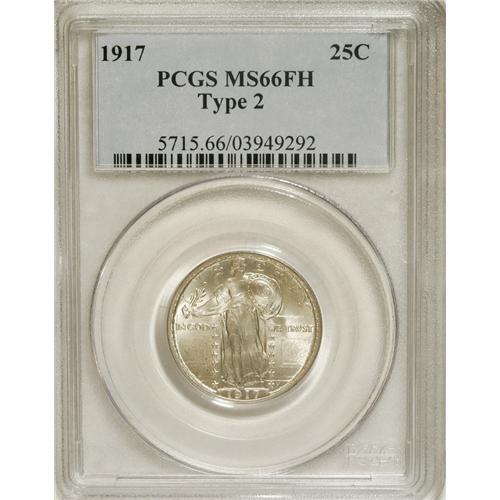 <B>1917 25C Type Two MS66 Full Head PCGS.</B></I> Modifications to the Type Two designs in 1917, according to J.H. Cline (2007), " ... created stress on the obverse die to produce the raised hair around Miss Standing Liberty's head, and caused the entire obverse to be weakly struck. This, in part, accounts for so many weak strikes." An above average strike on the current Full Head Premium Gem 1917 Type Two example results in sharp definition on Liberty's chain mail and gown lines, the rivets, and the vertical and horizontal lines of the inner shield. Pleasing luster exudes from surfaces delicately toned in barely perceptible tan and ice-blue hues. A few minute marks on Liberty's torso and legs do nothing to deny the great eye appeal of this lovely specimen. Population: 57 in 66 Full Head, 6 finer (4/07).<BR><BR><b>Shipping:</b> Coins & Currency (<a target="_blank" href="http://www.heritageauctions.com/common/shipping.php">view shipping information</a>)