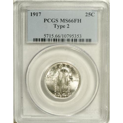 <B>1917 25C Type Two MS66 Full Head PCGS.</B></I> The outstanding strike on this Premium Gem transcends the Full Head to include crispness on the stripes of the inner shield, on the rivets, and on Liberty's chain mail and toes. Fabulous luster radiates from impeccably preserved, and nearly untoned surfaces; an occasional speckle of gold-tan appears under magnification. Population: 62 in 66 Full Head, 5 finer (1/07).<BR><BR><b>Shipping:</b> Coins & Currency (<a target="_blank" href="http://www.heritageauctions.com/common/shipping.php">view shipping information</a>)