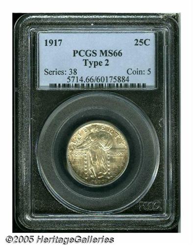 <B>1917<25C> Type Two MS66 PCGS.</B></I> A challenging coin at the Premium Gem level. Only ten pieces graded MS66 have appeared in major auction house sales over the past ten to twelve years, with five pieces grading higher (all MS67). This example displays radiant luster and dappled russet and sky-blue peripheral toning, being more developed on the reverse. The design elements are sharply struck, including excellent (though not full) definition on Liberty's head and on the shield. There are no marks of consequence. Population: 20 in 66, 1 finer (6/05).