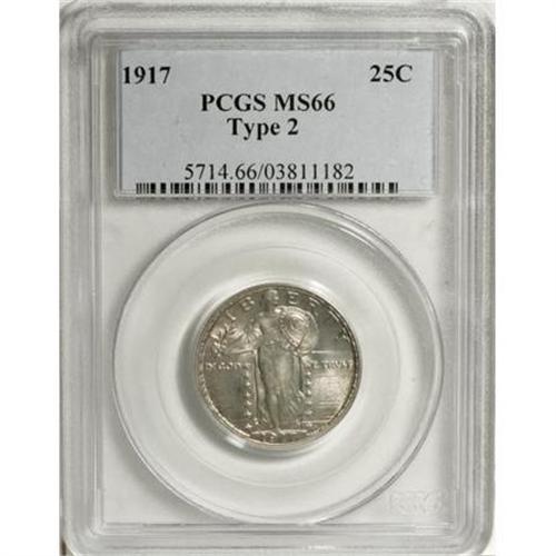 <B>1917 25C Type Two MS66 PCGS.</B></I> Though Liberty's head falls shy of full details, the rivets of the shield and other design elements are strong. A shining, minimally toned representative from the first year of the revised Standing Liberty design. Population: 20 in 66, 1 finer (8/07).<BR><BR><B>Coin Engraver:</B> Hermon A. MacNeil<BR><BR><b>Shipping:</b> Coins & Currency (<a target="_blank" href="http://www.heritageauctions.com/common/shipping.php">view shipping information</a>)