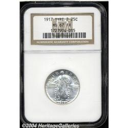 <B>1917<25C> Type Two MS67 Full Head NGC.</B></I> A highly lustrous and essentially brilliant Superb Gem. The reverse is seemingly free of even the slightest contact, while the obverse is also gorgeously preserved. The shield rivets have unusual definition for a Type Two, and the waist and inner shield are very sharp. The head is exquisitely detailed, with the hairline and ear hole strongly detailed. A magnificent coin that is worthy of the finest type set or specialized holding. Population: 7 in 67, 0 finer (7/04). <BR><BR><B>Important notice:</B> Heritage usually auctions material at the rate of 200-250 lots per hour. On some occasions eBay Live bid software or the Internet may not be able to keep up with the pace of the auction. We recommend placing a realistic absentee bid now as insurance to avoid disappointment. Occasionally the auctioneer may eliminate or reject an eBay Live bid, and the auctioneer may also reopen a lot after the close of the eBay live bidding (usually because we missed an audience bid), and may reject your bid even if it shows you as the winning bidder. By bidding via eBay Live, you agree that Heritage may award the lot to another bidder at its sole discretion under the circumstances described above or any other reasonable circumstances. Since eBay bids are not shown to us until we open the lot on the floor, we treat those bids just like floor bids. In most cases the floor responds before the eBay bid is presented to us, due to Internet lag time, so for consistency we have made it a policy that floor bids are always considered first over tie eBay live bids. Also please note that all Heritage lots purchased through eBay Live carry a 20% Buyer's Premium. Please make sure you read the Terms and Conditions before you bid. </span></font></tr></table></td></tr></table>