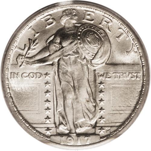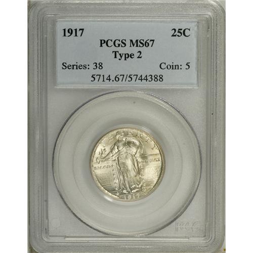 <B>1917 25C Type Two MS67 PCGS.</B></I> While Liberty's head may not be 100% full, one will hardly notice the lack of definition given this coin's awe-inspiring appearance and nearly pristine surface preservation. Delicate golden iridescence decorates vibrant, frosty textured features. Population: 1 in 67, 0 finer (12/06).<BR><BR><b>Shipping:</b> Coin/Currency (<a target="_blank" href="http://www.heritageauctions.com/common/shipping.php">view shipping information</a>)
