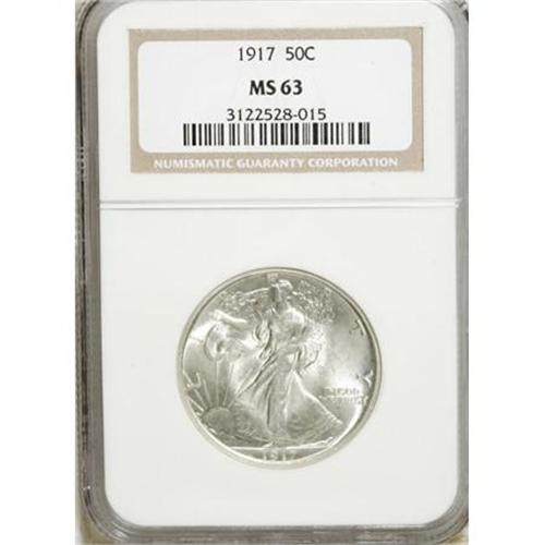 <B>1917 50C MS63 NGC.</B></I> NGC Census: (349/808). PCGS Population (503/901). Mintage: 12,292,000. Numismedia Wsl. Price for NGC/PCGS coin in MS63: $164. (#6569)<BR><BR><B>Coin Engraver:</B> Adolph A. Weinman<BR><BR><b>Shipping:</b> Coins & Currency (<a target="_blank" href="http://www.heritageauctions.com/common/shipping.php">view shipping information</a>)