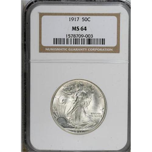 <B>1917 50C MS64 NGC.</B></I> NGC Census: (565/242). PCGS Population (556/329). Mintage: 12,292,000. Numismedia Wsl. Price for NGC/PCGS coin in MS64: $280. (#6569)<BR><BR><B>Coin Engraver:</B> Adolph A. Weinman<BR><BR><b>Shipping:</b> Coins & Currency (<a target="_blank" href="http://www.heritageauctions.com/common/shipping.php">view shipping information</a>)