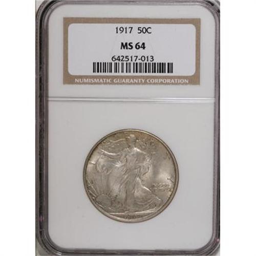 <B>1917 50C MS64 NGC.</B></I> . NGC Census: (569/249). PCGS Population (579/337). Mintage: 12,292,000. Numismedia Wsl. Price for NGC/PCGS coin in MS64: $300. (#6569)<BR><BR><B>Coin Engraver:</B> Adolph A. Weinman<BR><BR><b>Shipping:</b> Coins & Currency (<a target="_blank" href="http://www.heritageauctions.com/common/shipping.php">view shipping information</a>)