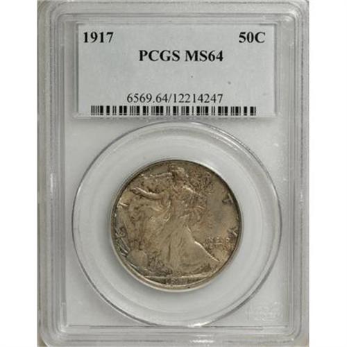 <B>1917 50C MS64 PCGS.</B></I> PCGS Population (583/342). NGC Census: (569/249). Mintage: 12,292,000. Numismedia Wsl. Price for NGC/PCGS coin in MS64: $300. (#6569)<BR><BR><B>Coin Engraver:</B> Adolph A. Weinman<BR><BR><b>Shipping:</b> Coins & Currency (<a target="_blank" href="http://www.heritageauctions.com/common/shipping.php">view shipping information</a>)