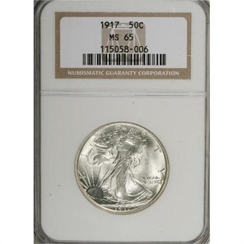 <B>1917 50C MS65 NGC.</B></I> Uncommonly strong detail and vibrant luster are the main attractions of this outstanding Gem. The silver-white surfaces are delightfully preserved and appealing.<BR><BR><B>Coin Engraver:</B> Adolph A. Weinman<BR><BR><b>Shipping:</b> Coins & Currency (<a target="_blank" href="http://www.heritageauctions.com/common/shipping.php">view shipping information</a>)