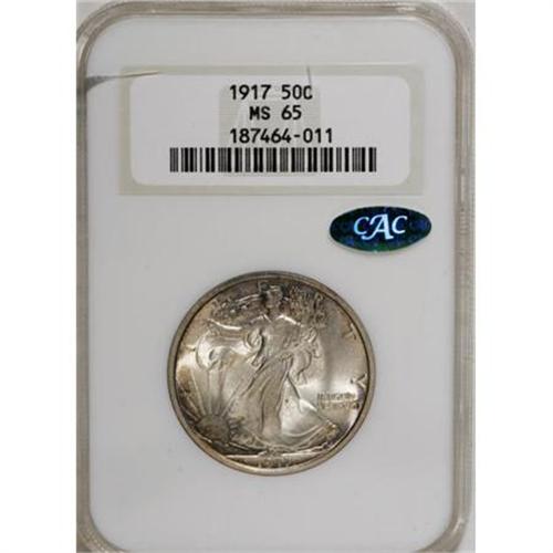 <B>1917 50C MS65 NGC. CAC.</B></I> Excellent detail and strong, swirling luster are the prime attributes of this gorgeous Gem. Hints of reddish-orange and blue-violet toning visit the peripheries, while the centers are essentially brilliant. NGC has certified 47 finer pieces (1/08).<BR><BR><B>Coin Engraver:</B> Adolph A. Weinman<BR><BR><b>Shipping:</b> Coins & Currency (<a target="_blank" href="http://www.heritageauctions.com/common/shipping.php">view shipping information</a>)